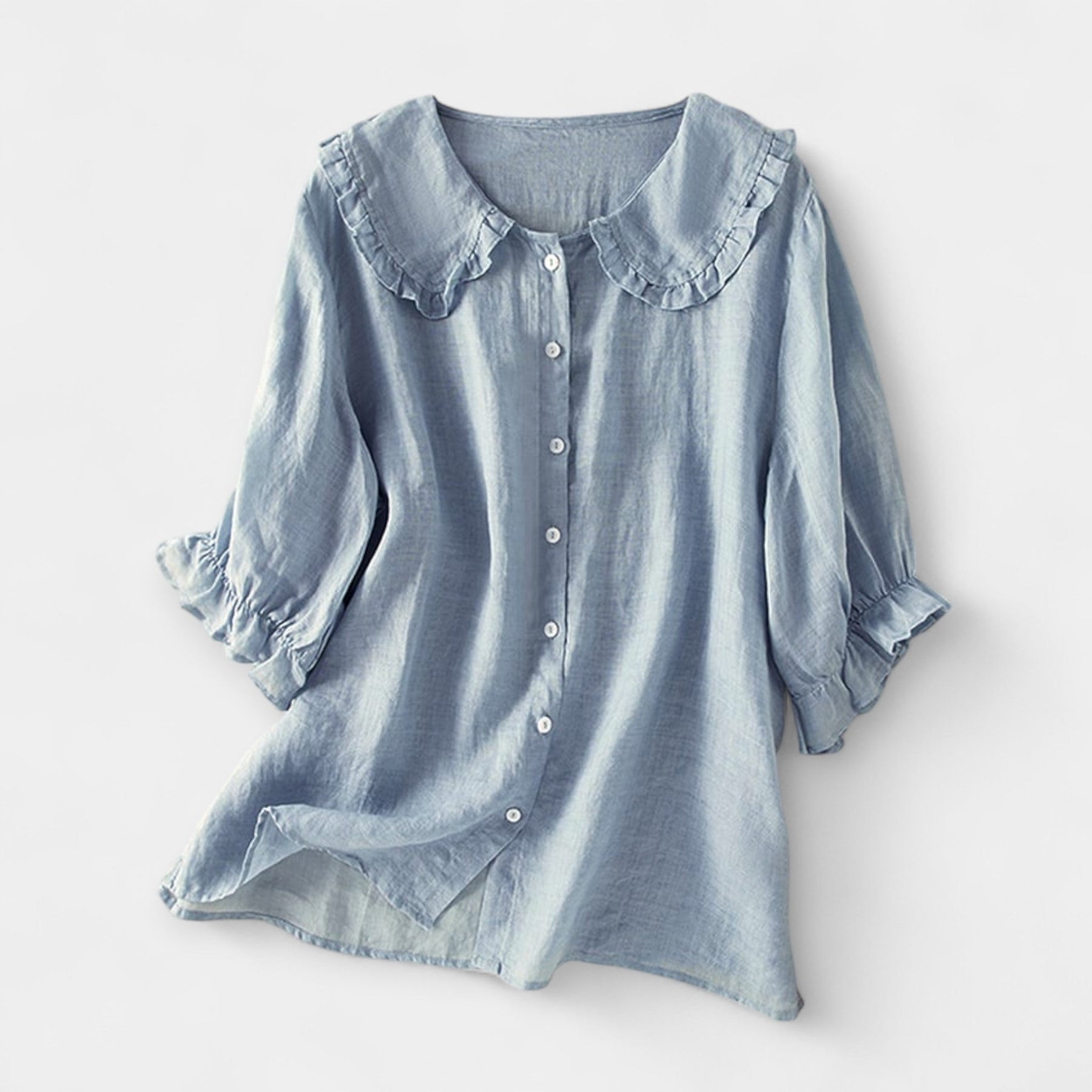 A playful shirt made from a lightweight blend of cotton and linen that combines elegance and comfort. The Peter Pan collar with frills adds a unique detail that elevates any casual outfit, perfect for skirts or trousers.